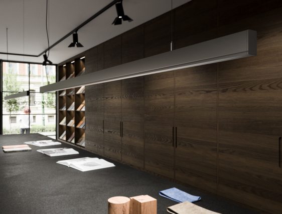 Hangend LED-systeem met een ingebouwde voeding. Het scharnierende profielontwerp maakt eenvoudige onderhoud en vervanging van de voeding mogelijk zonder de gehele armatuur te verwijderen.