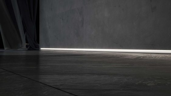 TIANO-profiel geïnstalleerd tussen gipsplaat en vloer met ACRYLIC-afdekking, gebruikmakend van montagelijm.