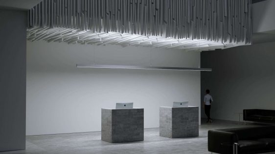 Eindresultaat van montage van profiel DULIO met verborgen voeding, gebruikmakend van Y-type pendels, een WIDE afdekking en een DOUBLE afdekking