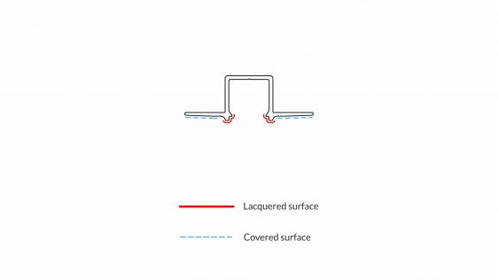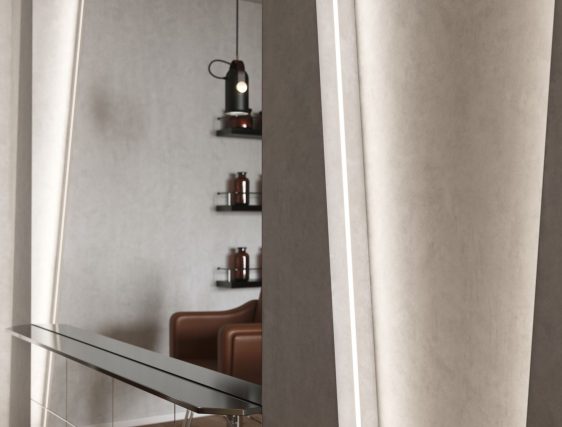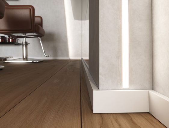 Eindresultaat van de montage van het GAUDI-profiel met BASIC-afdekking, verzonken gemonteerd tussen twee gipsplaten met afgewerkte pleister